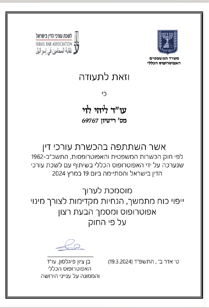 בעלת ניסיון של למעלה מעשור בתחום המשפטים, עם התמחות מעשית ומעמיקה בעריכת ייפוי כוח מתמשך. במהלך השנים ליוויתי לקוחות רבים בתהליכים משפטיים חשובים, מתוך מטרה אחת ברורה: לאפשר להם להבטיח את עתידם האישי והמשפחתי בצורה הבטוחה, השקטה והמדויקת ביותר. הניסיון שצברתי מאפשר לי להעניק ליווי משפטי מקצועי, אחראי ויסודי, תוך התאמה אישית מלאה לצרכים, לערכים ולהעדפות של כל לקוח. ההליך כולל ניסוח פרטני של ייפוי הכוח, בדיקת כשירות ומהימנות של מיופה הכוח, והסבר מלא לכל החלטה הנוגעת להווה ולעתיד. אני מקפידה על יחס אישי, שקיפות מלאה, זמינות גבוהה ונגישות מלאה – כולל אפשרות לפגישות ייעוץ ללא עלות, במשרד, בבית הלקוח או אונליין – על מנת להפוך את התהליך לפשוט, נוח ומדויק.